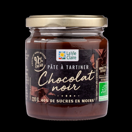 Une pâte à tartiner bio au chocolat noir. Sans huile de palme et avec 40% de sucre en moins, elle allie la richesse du cacao à une texture onctueuse. La vie claire, 5,49 €, le pot de 390g.