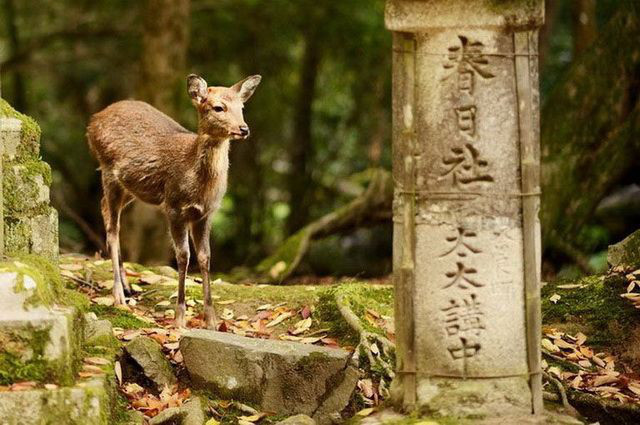 Entre temps une parenthèse enchantée s’ouvre, non loin de Kyoto, à Nara. La terre des temples, la réserve naturelle des cervidés, à savoir un millier de daims et de biches. Au cœur de ce territoire les Bambi sont chez eux, en toute liberté. Ils vous accueillent, ils vous entourent, ils se laissent nourrir, caresser, photographier ; parfois, ils s’écartent trottent en solitaires ou rejoignent leur petite famille au pied d’un arbre.