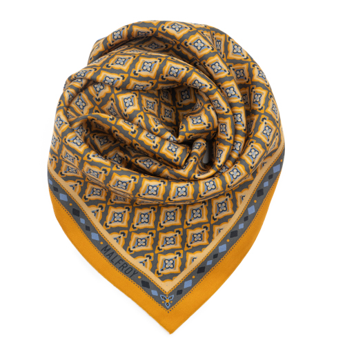 Valeur sûre, rétro chic et touche mode à la fois, ce grand carré en twill de soie naturelle imprimée block print est parfaitement dans le ton des tendances. Succès garanti ! Malfroy 95 €.
