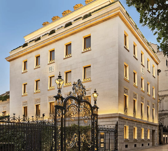 - des espaces de restauration échelonnés sur plusieurs étages : Le Jardin RH, une élégante serre vitrée; Le Petit RH, un restaurant rooftop offrant une vue spectaculaire sur Paris ; et The World of RH Bar & Lounge, un lounge-cocktail conçu comme un salon de maison cosmopolite