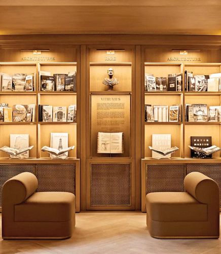 Dès l’entrée, libre pour tout le monde, une bibliothèque de l’architecture, du design intérieur et du paysage invite à la promenade intellectuelle et esthétique. On peut y admirer une vitrine fermée et sécurisée, exposant un trésor : une première édition latine de De Architectura de Vitruve (1521), un acte de foi dans l’harmonie architecturale, un clin d’œil direct à Léonard de Vinci et à la philosophie du design de RH. Le personnel, nombreux n’est pas avare d’explications si vous en demandez.