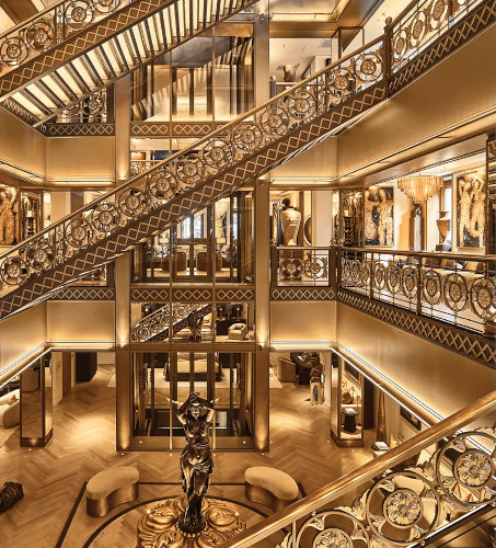 L’effet “maison de maître chic” est immédiat. On ne pénètre pas dans une boutique, mais dans une succession d’espaces intimistes fait de salons feutrés, de chambres à coucher, de bibliothèques, de galeries d’art et de coins de conversation. Les grandes portes en bronze et la grille en fer forgé restaurée ouvrent sur un petit jardin intérieur ou une allée bordée de buis avec un confortable mobilier de jardin qui entoure des cheminées à éthanol. Cela donne l’impression d’entrer chez un particulier